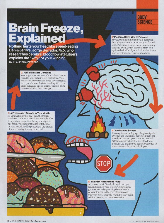 Articles Men's Health Magazine Print Articles Brain Freeze, Explained K. Aleisha FettersJuly 19, 201504.1K views Nothing hurts your head like speed-eating Ben & Jerry’s. Jorge Serrador, Ph.D., who researches cerebral blood flow at Rutgers, explains the “why” of your wincing.